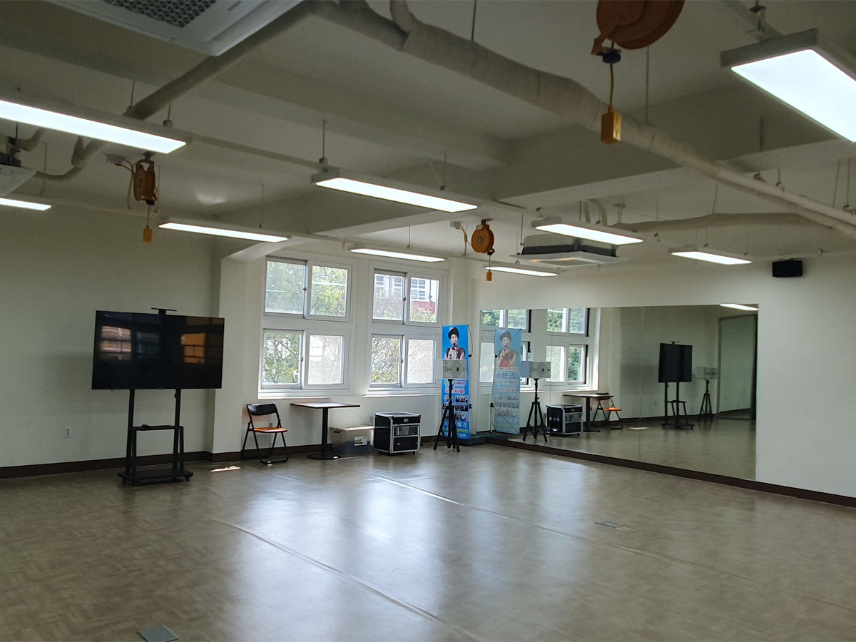 TV(노트북 연결가능), 벽면대형거울, 의자(16개), 간이테이블 2개, 무선마이크 2개, 스피커 1쌍