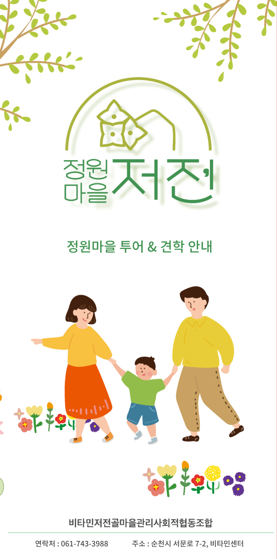 저전동 마을조합은 순천시 도시재생 사업을 통해 시작되어, 지역의 어린이, 청년, 중장년 등 모든 세대가 행복한 생태 마을을 만들기 위해 저전동 마을주민들이 설립한 마을조합입니다.